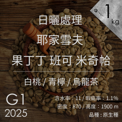 產品說明 產地 :衣索比亞 產區 : YIRGACHEFFE 耶家雪夫 地區 : 果丁丁 班可 米奇帢 產地高度 : 海拔 1900 品種 : 衣索比亞原生種 等級 :G1 含水量 : 11.0 密度 : 870 瑕疵率 :1.1%