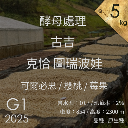 產品說明 產地 :衣索比亞 產區 : GUJI 古吉 地區 : 克恰 圖瑞波娃 產地高度 : 海拔 2300 品種 : 衣索比亞原生種 等級 :G1 含水量 : 10.7 密度 : 854 瑕疵率 :2.0%