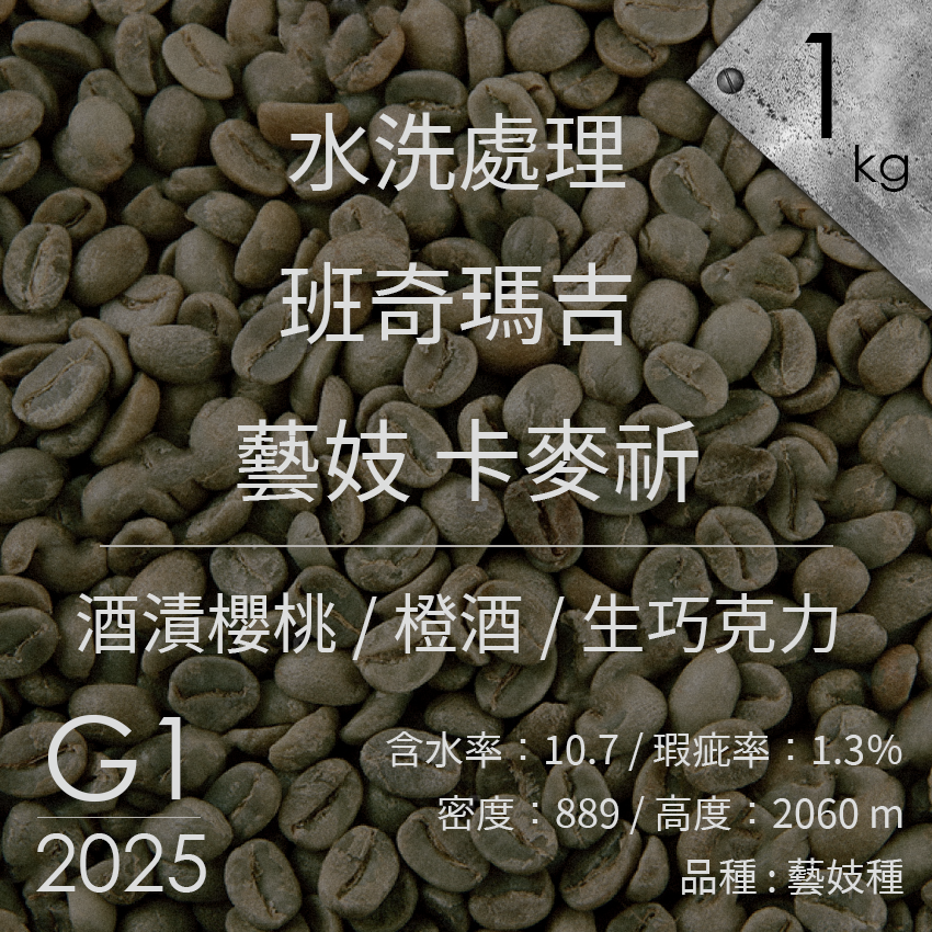 產品說明 產地 :衣索比亞 產區 : 班奇瑪吉 地區 : 卡麥祈 產地高度 : 海拔 2060 品種 : 衣索比亞藝妓種 等級 :G1 含水量 : 10.7 密度 : 889 瑕疵率 :1.3%