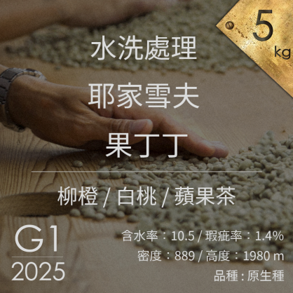 產品說明 產地 :衣索比亞 產區 : YIRGACHEFFE 耶家雪夫 地區 : 果丁丁 產地高度 : 海拔 1980 品種 : 衣索比亞原生種 等級 :G1 含水量 : 10.5 密度 : 889 瑕疵率 :1.4%